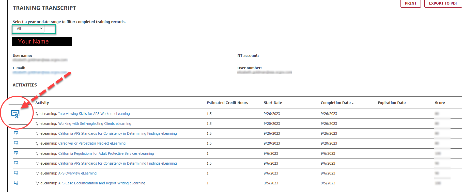 2.On your Learner Dashboard, click on TRAINING TRANSCRIPT to access a list of trainings that have been completed .